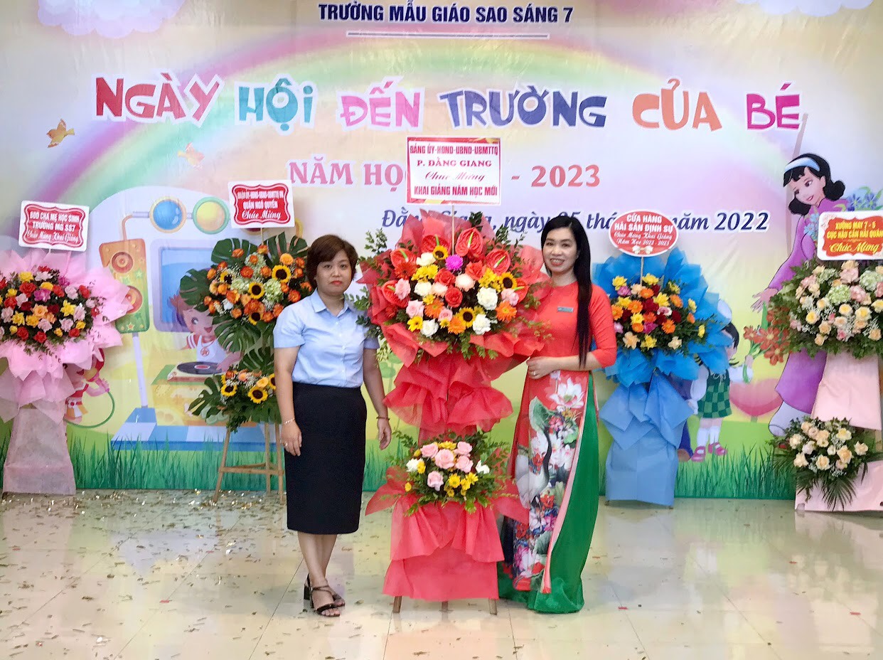 Những lẵng hoa tươi thắm thể hiện tình cảm yêu quý của các cơ quan đoàn thể dành cho tập thể trường Mẫu giáo Sao Sáng 7