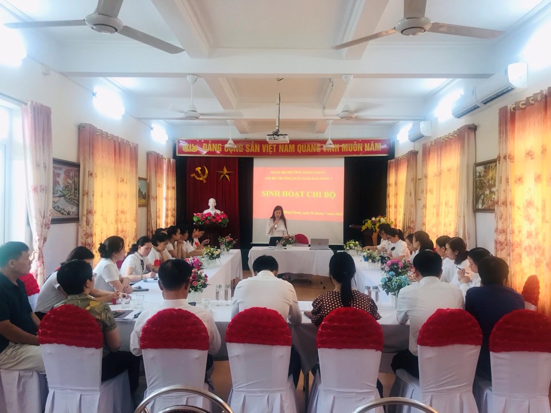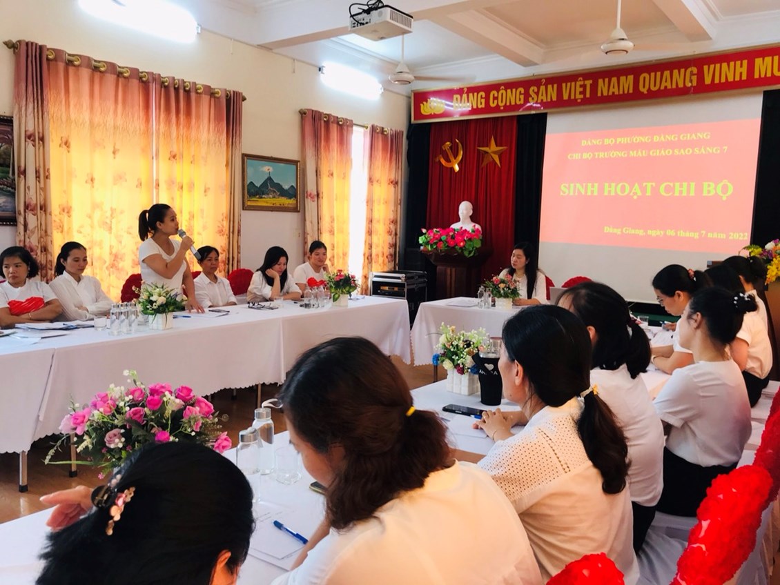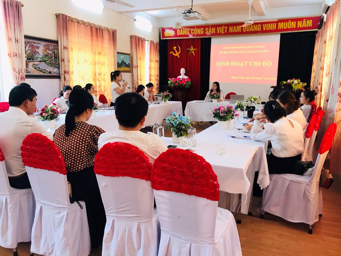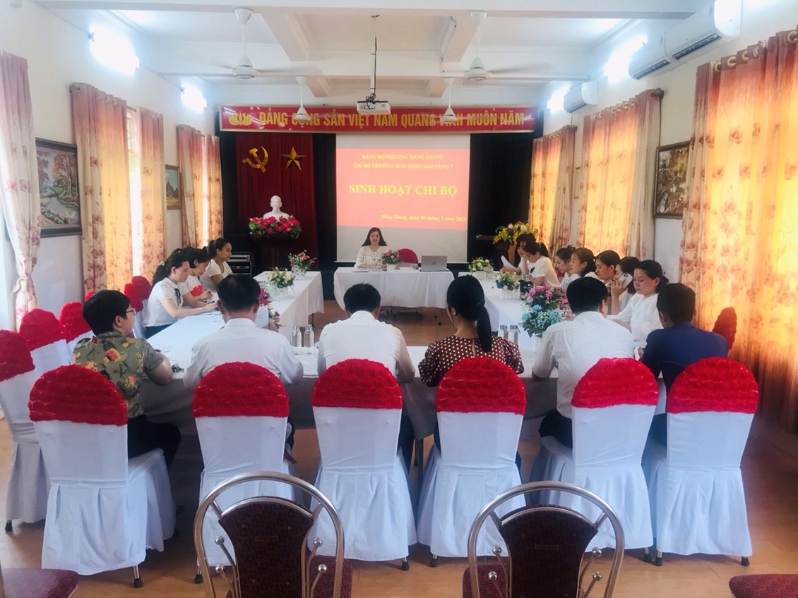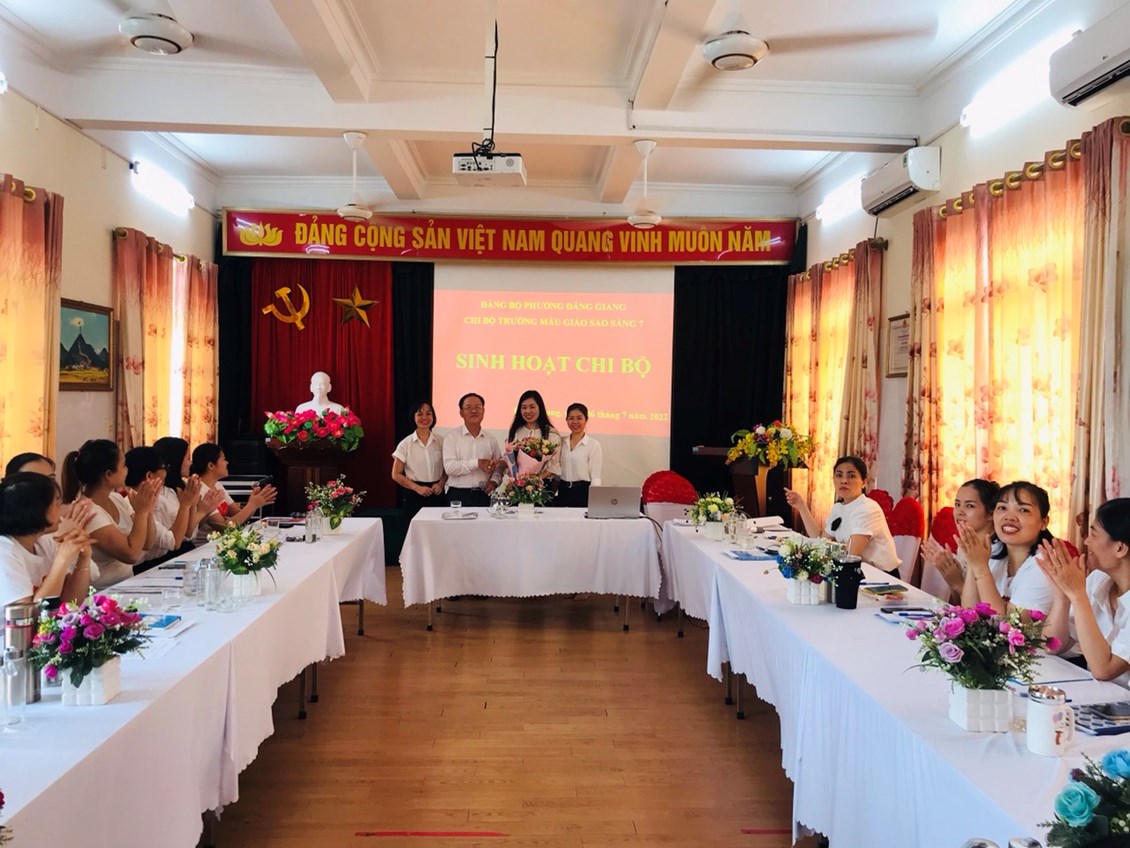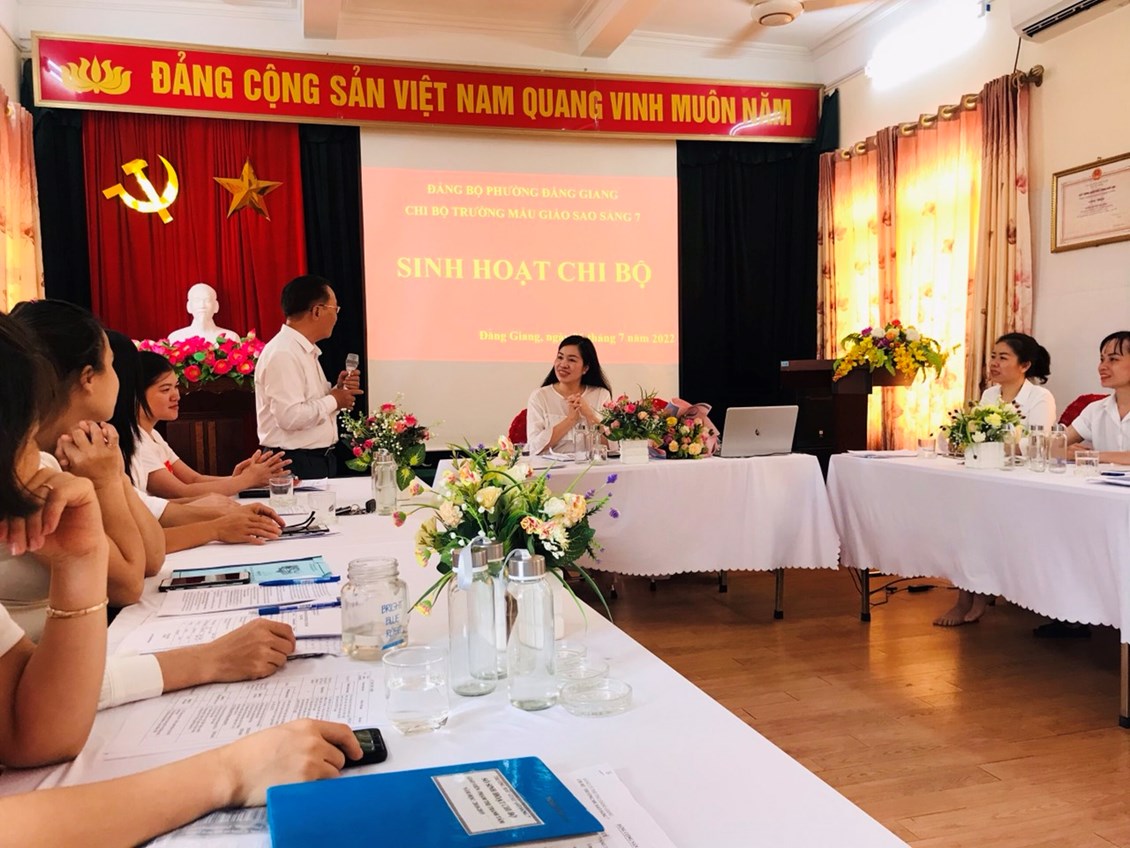 Thực hiện Nghị quyết số 02-NQ/QU của Ban Thường vụ Quận ủy về củng cố, nâng cao năng lực lãnh đạo, sức chiến đấu của tổ chức cơ sở đảng và đảng viên tại Đảng bộ Quận Ngô Quyền trong hình hình hiện nay; Công văn số 754-CV/QU về việc sinh hoạt chi bộ theo Quy trình và Căn cứ Quy trình sinh hoạt Chi bộ thường kỳ của Ban Tổ chức Quận ủy Ngô Quyền; Thực hiện nhiệm vụ Đảng ủy Phường Đằng Giang giao. Sáng ngày 6/7/2022 Chi bộ trường Mẫu giáo Sao Sáng 7 tổ chức Sinh hoạt Chi Bộ điểm. Tới dự buổi sinh hoạt có Đồng chí Bí thư Đảng ủy Phường Đằng Giang cùng đoàn công tác và các đồng chí đại biểu đại diện Chi bộ trường học, chi bộ khối hành chính sự nghiệp trên địa bàn phường.