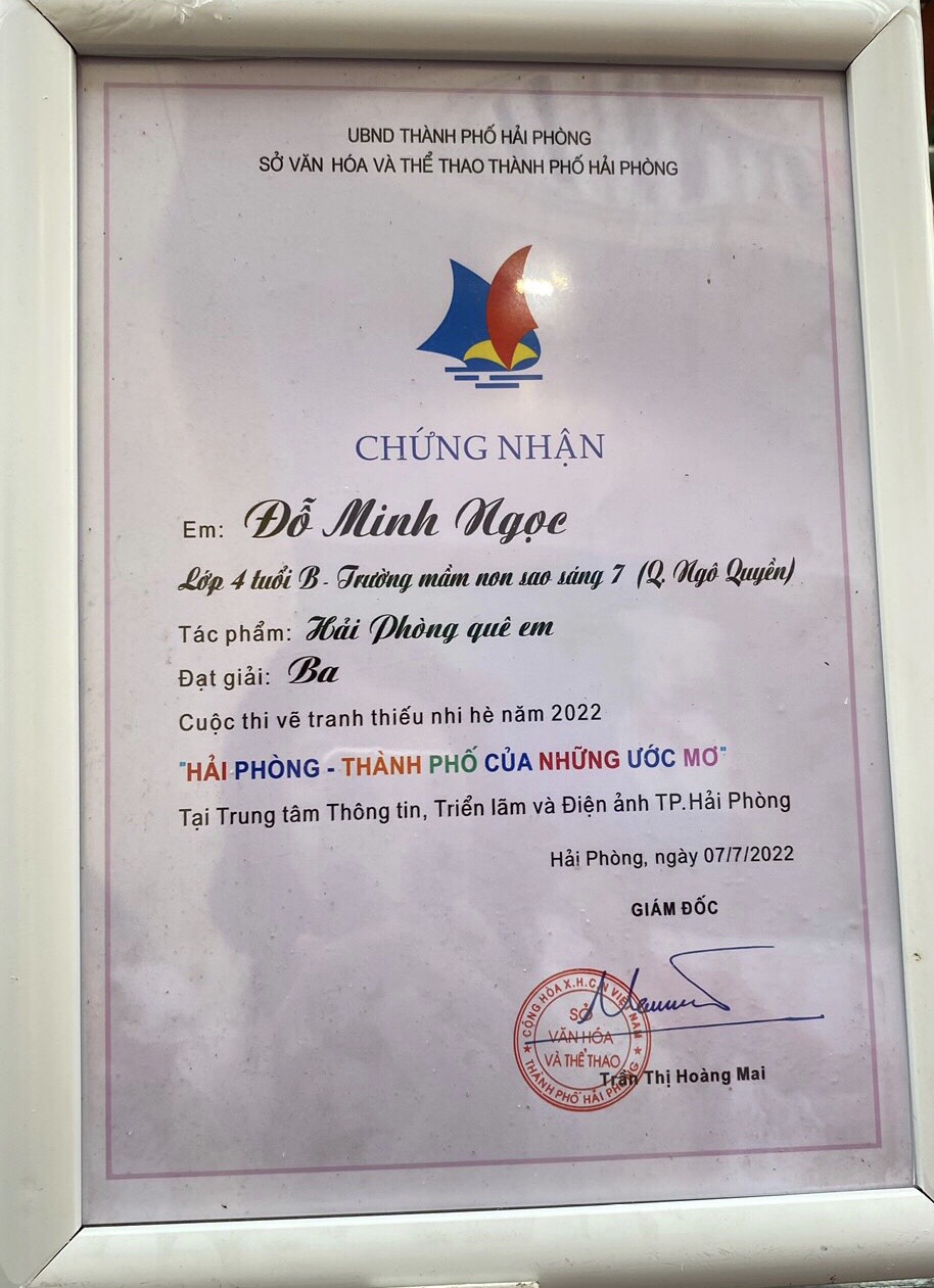 Chúc mừng bé Đỗ Minh Ngọc, 4 tuổi, học sinh Trường Mẫu giáo Sao Sáng 7 - THÍ SINH NHỎ TUỔI NHẤT tham dự cuộc thi vẽ về "Hải Phòng - thành phố của những ước mơ" do Trung tâm Thông tin, Triển lãm và Điện ảnh thuộc Sở văn hóa và thể thao Thành phố Hải Phòng tổ chức. Đã đạt GIẢI BA cấp thành phố với đề tài "Hải Phòng quê em"