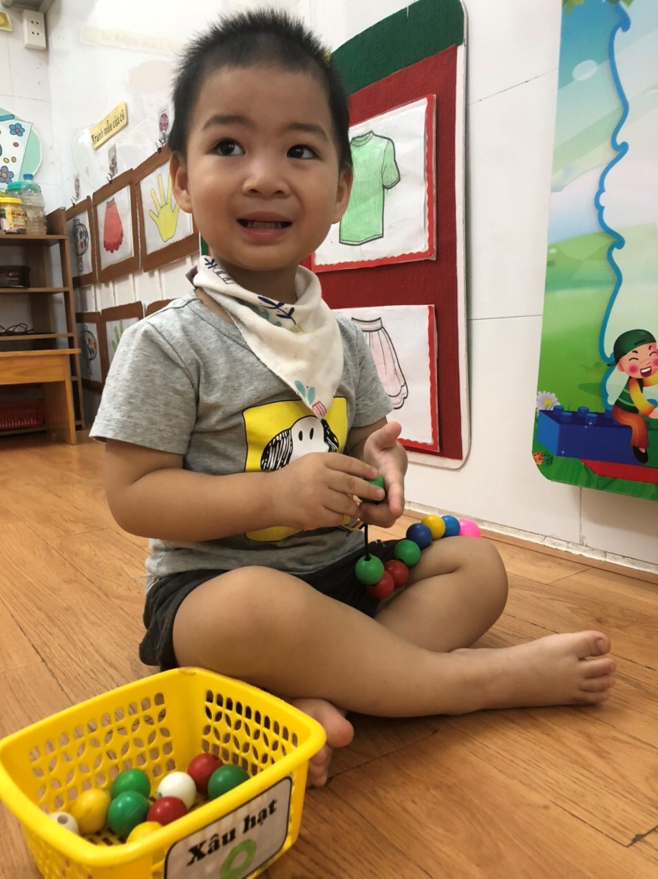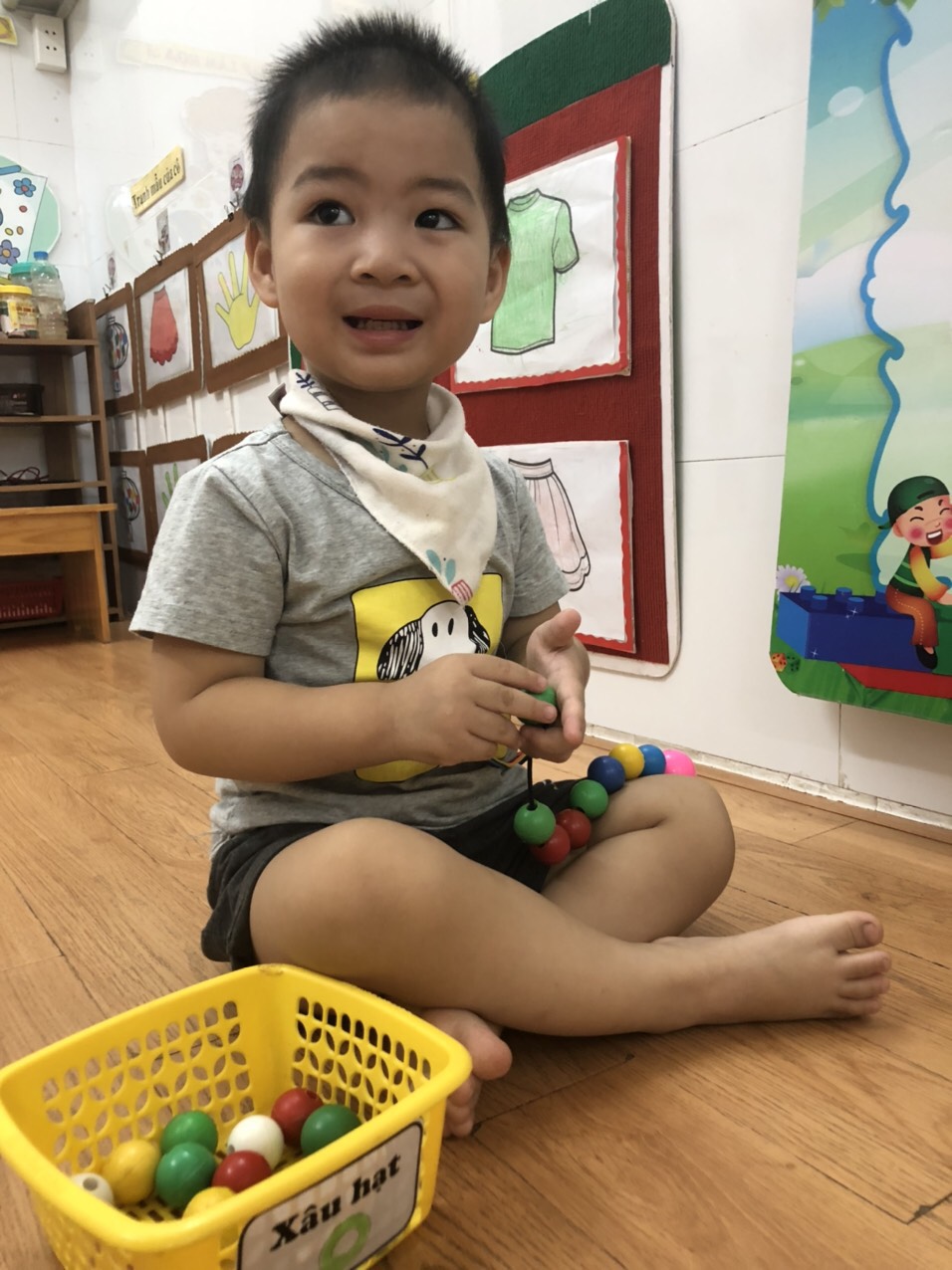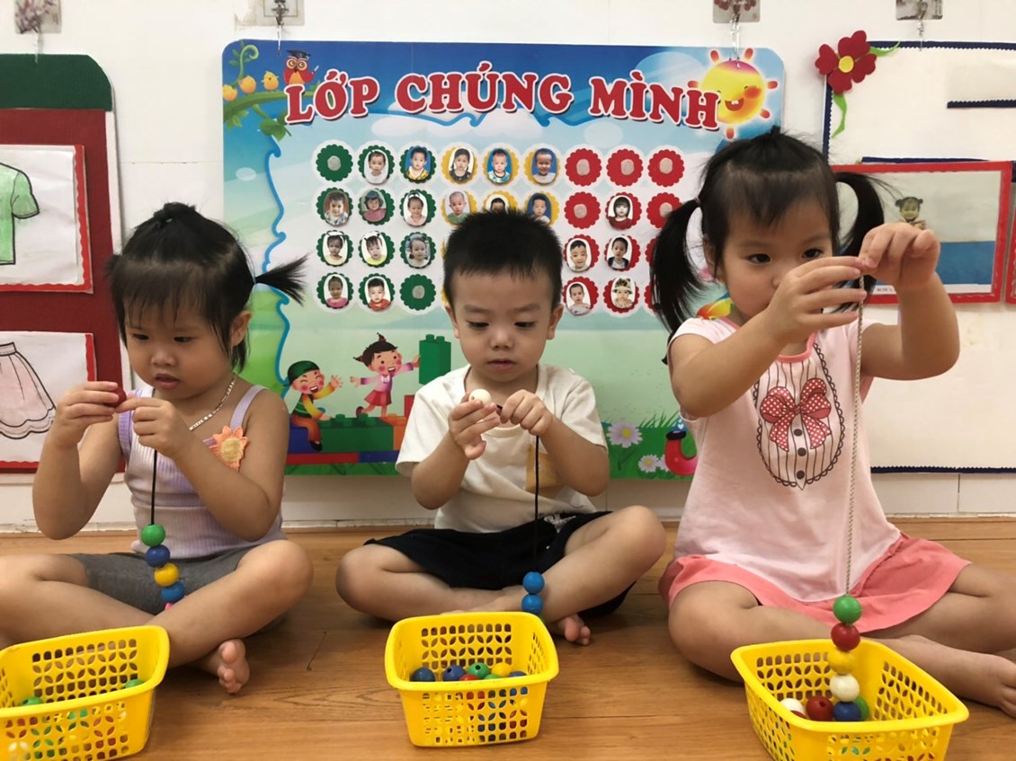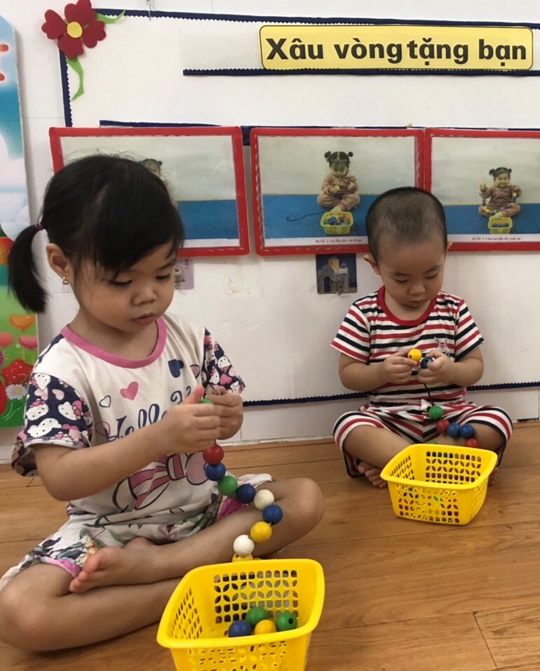 Ngày thứ 7 đi học mà chúng cháu "Bận bịu" quá các bác các cô ạ, cô giáo giao nhiệm vụ cho chúng cháu XÂU VÒNG để trang trí lớp học chào đón năm học mới.