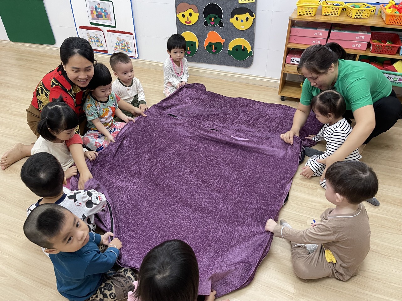 Hôm nay chúng cháu có ga mới để bọc đệm, cả lớp xúm xít quanh cô để chuẩn bị giớ ngủ trưa!