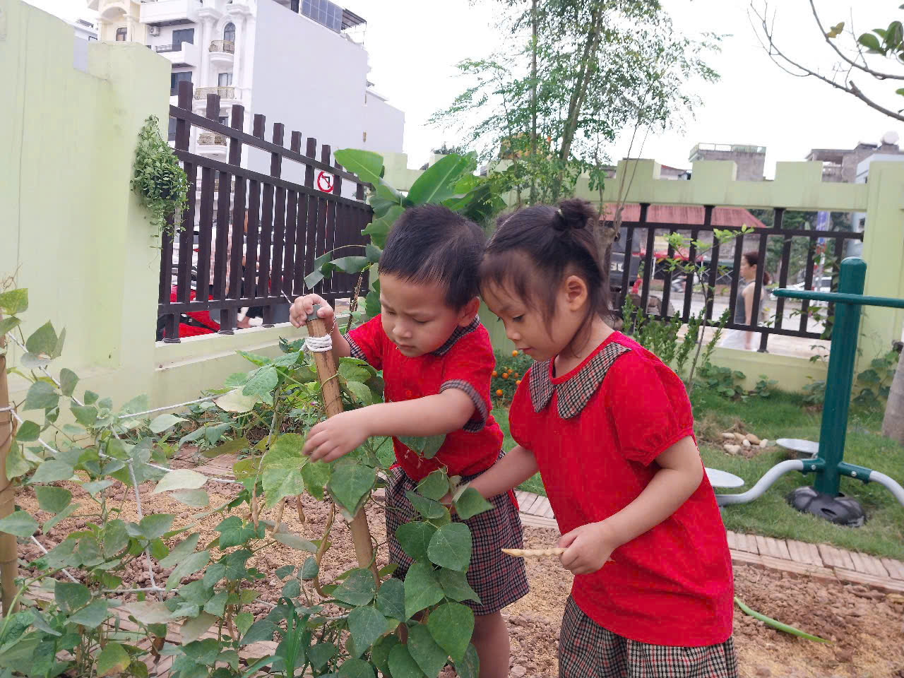 Sáng nay, các bé đã cùng cô giáo tự tay hái những trái đỗ xanh mướt trong vườn trường.
