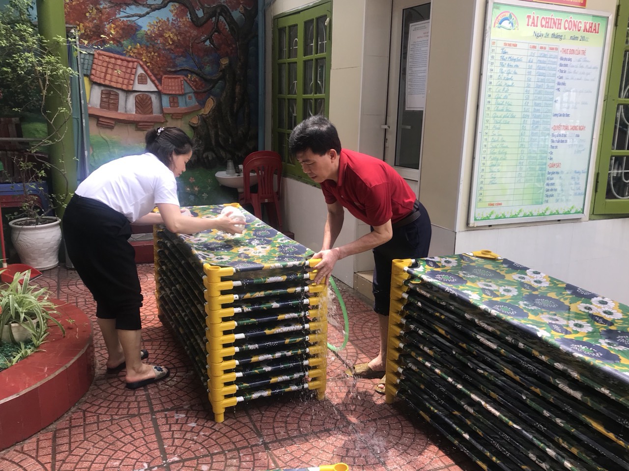 Công tác vệ sinh khử khuẩn tại trường Mẫu giáo Sao Sáng 7. Trong thời tiết giao mùa khí hậu rất thuận lợi cho các vi khuẩn phát triển. Đề phòng tránh dịch bệnh thuỷ đậu, chân tay miệng các cô giáo đã tiến hành đánh giường chiếu giặt chan ga để đảm bảo vệ sinh cho học sinh phòng tránh dịch bệnh.